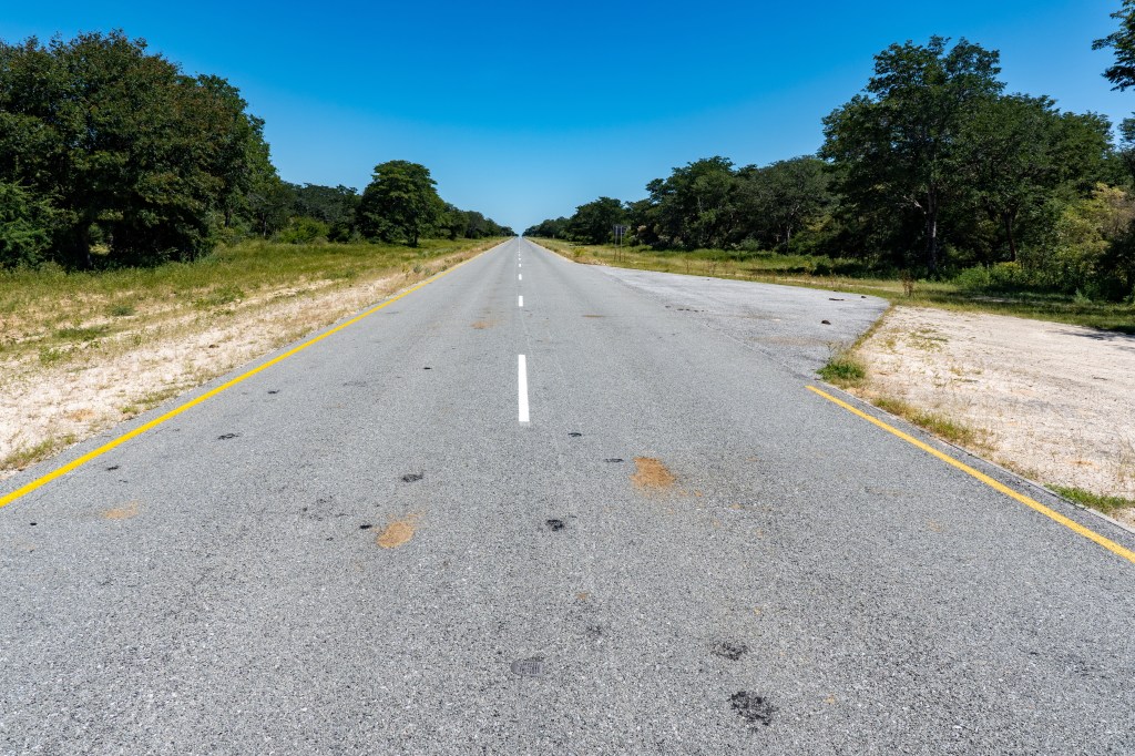 Schnurgerade zieht sich die Teerstrasse dahin. Keine Kurve, keine Senke unterbricht unser meditatives Geradeausfahren. Das Thermometer zeigt muckelige 32°C an und die Sonne lässt den Teer am Horizont flimmern. Wir fahren dem Caprivizipfel 500 lange, gerade Kilometer entgegen. Links von uns liegt Angola, rechts der Strasse das Ovambaland. Alle 100 Kilometer stoppen wir auf einem „Rastplatz“ mit mal etwas mehr, mal etwas weniger Schatten. Die Raucher paffen schnell ihre Zigarette. Bevor es weiter rollt tauschen wir noch Fahrerin / Fahrer. Grössere Siedlungen gibt es nicht … Geschwindigkeitsbegrenzungen regulieren uns von 120 km/h (fahren wir fast nie) auf 100 und dann 60 km/h herunter, wenn eine kleine Ortschaft mit kleinen Wellblech-Läden und bunt bemalten Shebeen (Kneipen) an uns vorbei ziehen.