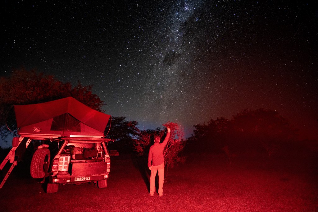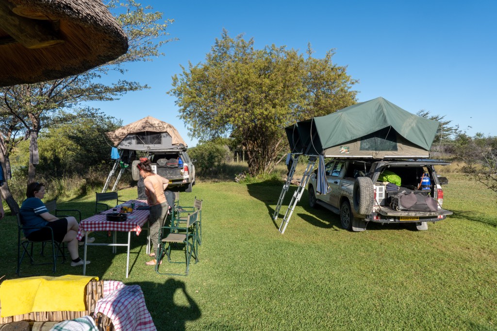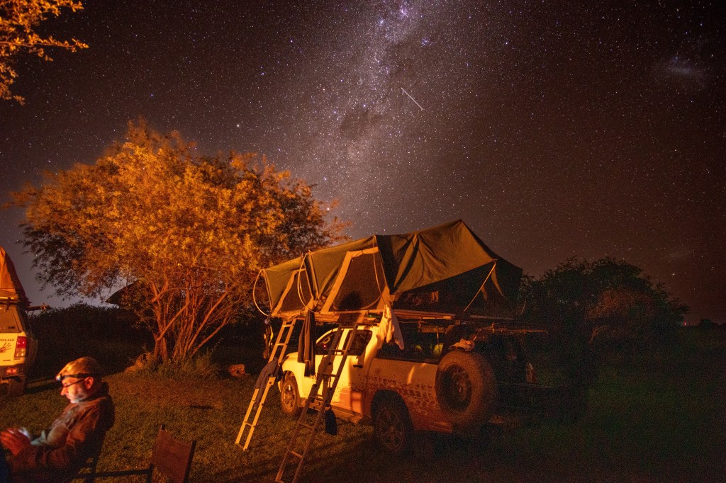 3 Uhr nachts! Erst stampft etwas, dann zupft da draussen jemand büschelweise das Gras. Wir spähen aus unseren Dachzelten. Inzwischen ist der Mond aufgegangen und bescheint fast taghell die Wiese vor unseren Jeeps. Mitten auf der Wiese, nur 5 Meter von uns entfernt steht ein Hippo. Ein langgestreckter, gedrungener, massiger Körper. Es grast friedlich. Leise rufen wir unsere Mitreisenden und Conny, Christiane, Angelique und Thomas beobachten das Hippo … nur Sebastian verschläft das Highlight. Allerdings bewegen wir uns zu sehr und die Fahrzeuge knarzen zwar leise aber ausreichend laut, um das Flusspferd auf uns aufmerksam zu machen. Schwerfüsssig stapft es zum Flussufer und mit einem lauten Platscher (ja Sebastian, sehr laut vernehmlich) plumpst es in den Okavango.