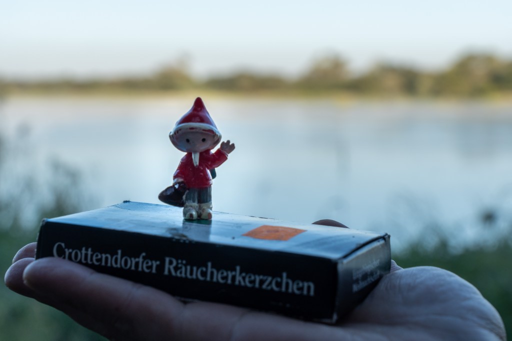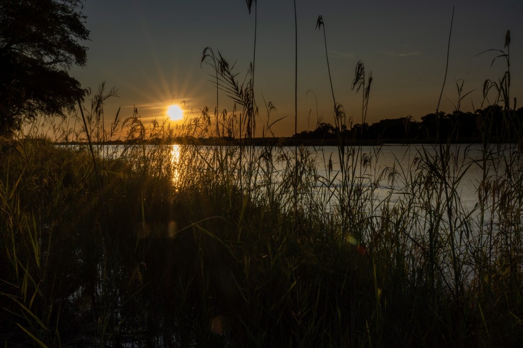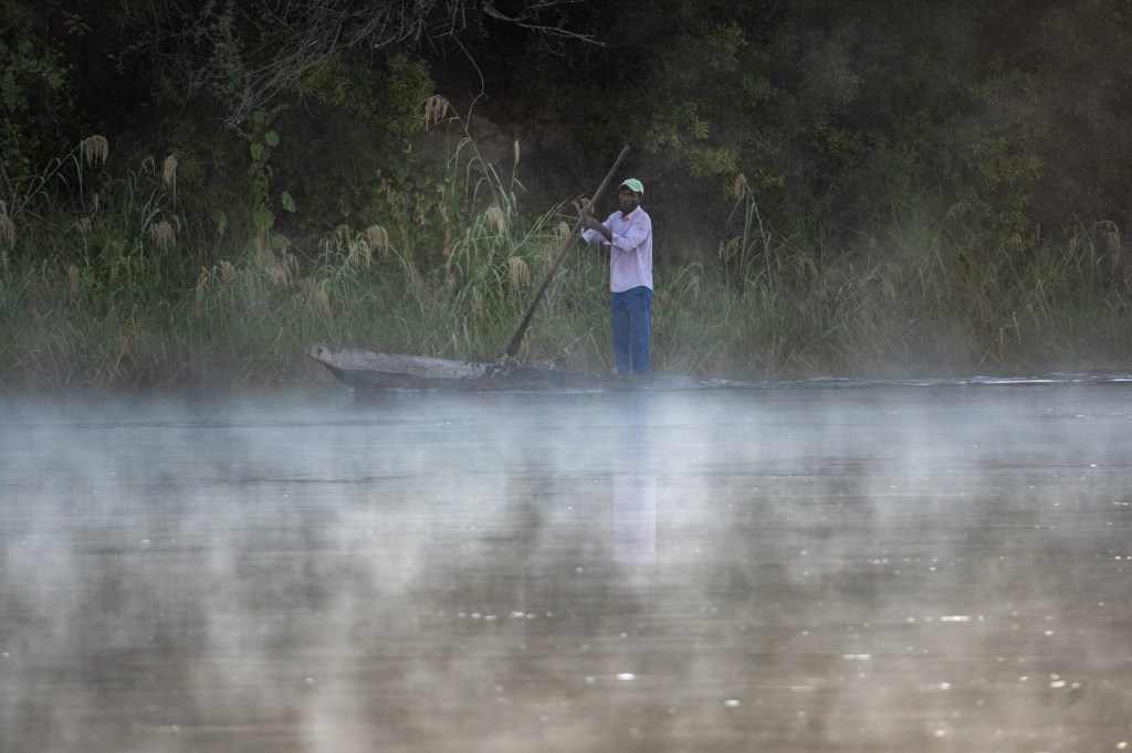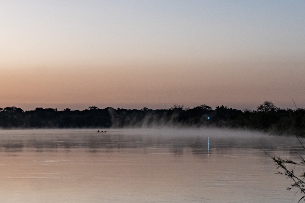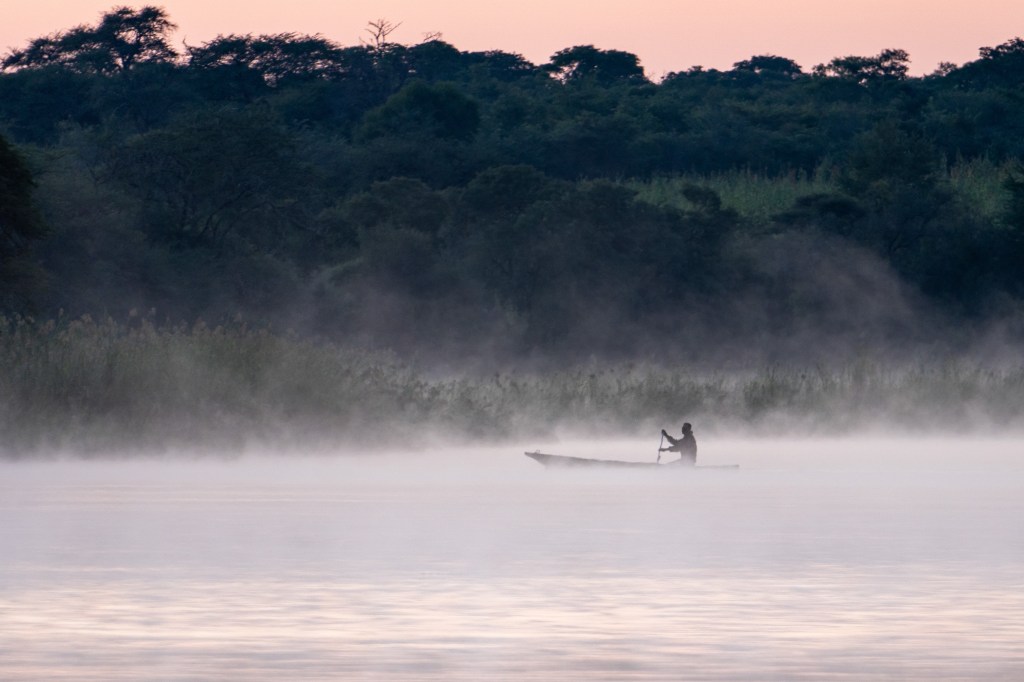 So spektakulär wie die Nacht, so spektakulär ist der Morgen. Ich bin bereits um 6 Uhr wach und krieche aus dem Zelt. Im grauen Zwielicht sehe ich Nebelschleier vom Fluss aufsteigen. Eine mystische Stimmung. In der Ferne wird ein Einbaumboot mit schnellen Paddelschlägen von der angolanischen Seite zur namibischen Seite vorangetrieben. Auf dem Hinweg ist das Boot voll besetzt, kehrt aber nach wenigen Minuten aus der Deckung des Nebels nur noch mit dem Bootsführer zurück. Kleiner Grenzverkehr! Ich beobachte am gegenüberliegenden Ufer einen Fischer (?) der stehend mit einem Stechpaddel am Ufer entlang gleitet. Und dann geht die Sonne auf und verwandelt das Grau in glühendes Rot.