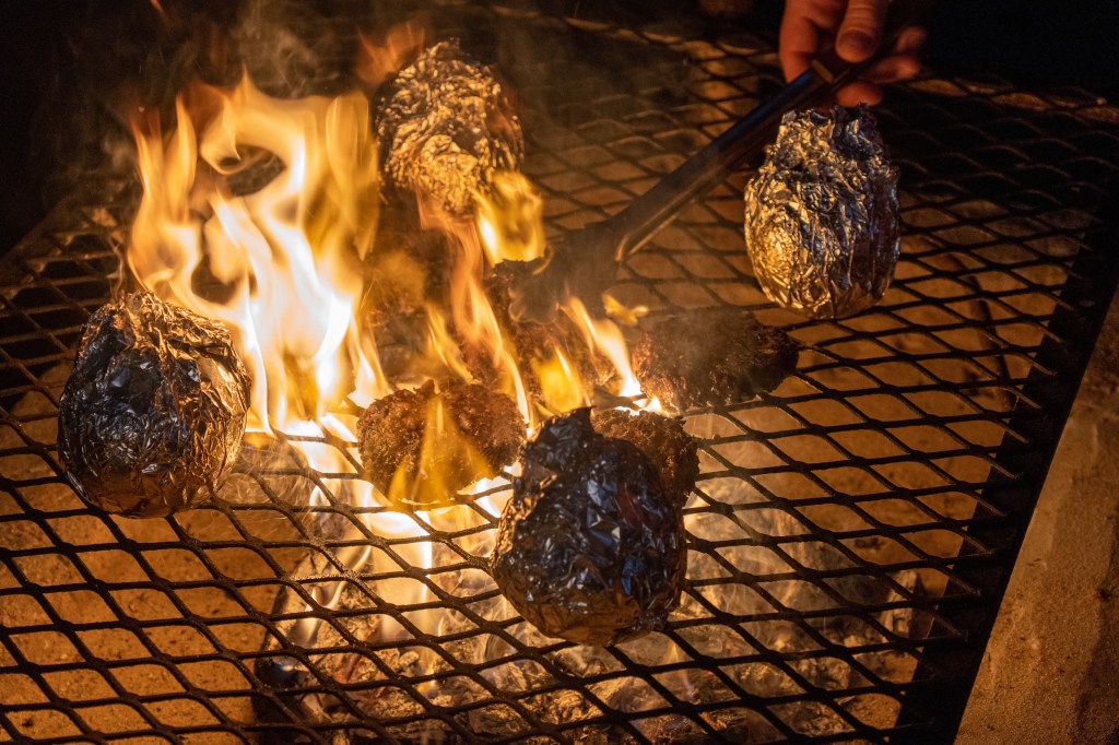 Der Stellplatz eignet sich super zum entspannten Kochen am Lagerfeuer. Es gibt Steaks mit selbstgemachtem Nudelsalat …. mit ausgezeichneter Weinbegleitung. Dann dunkelt es schnell ein und wieder wölbt sich die Galaxie über uns mit unendlich vielen funkelnden Sternen. Wir kriechen in unsere Dachzelte und schlummern schnell ein.