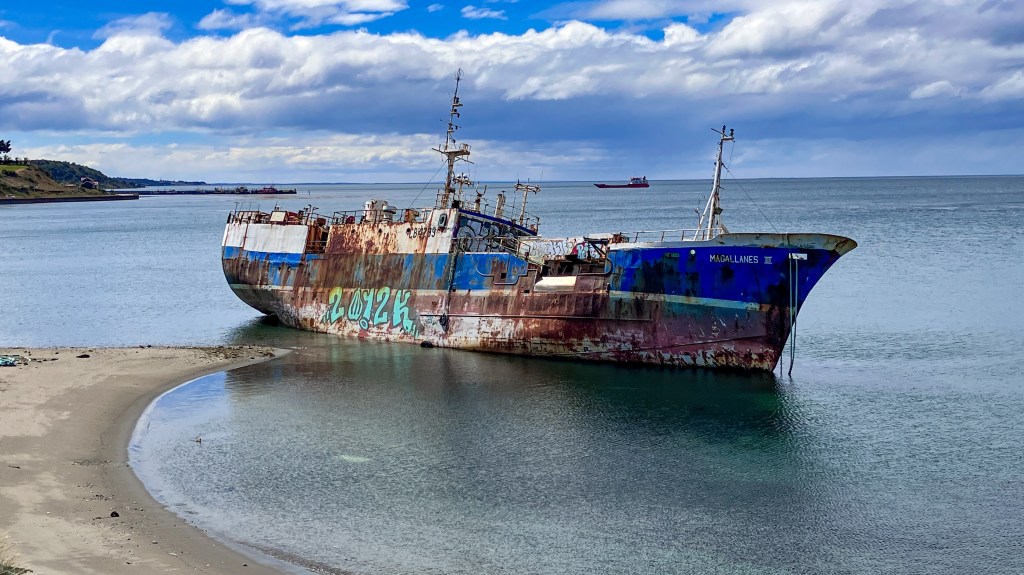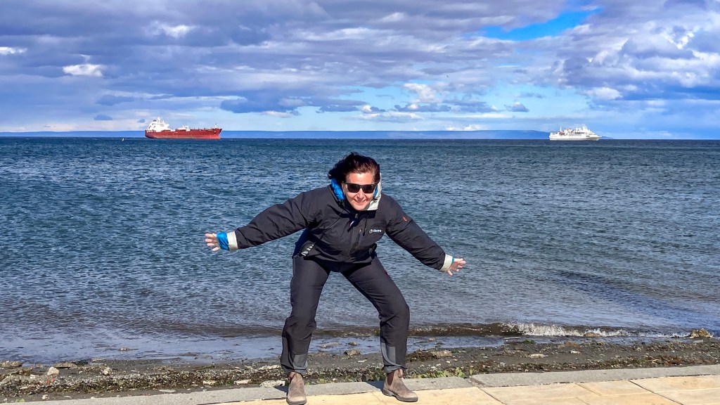 Im Anflug auf Punta Arenas hat unser Flugzeug im tiefen Landeanflug seine letzte Kurve über der Magellan Meeresstrasse gedreht. Aus den runden Fenstern blicken wir auf eine grössere Hafenstadt hinunter. Die Sonne glitzert in der ruhigen See und die Maschine setzt sanft auf der Landebahn des Flughafens auf. Ich gebe zu, ich hatte Respekt vor dem Flug (eventuell Angst 😇). Ich musste an die angelesenen Schilderungen vom sturmgepeitschten Kap Horn denken und wie glücklich die Seefahrer waren, wenn sie nach der wilden Umfahrung der Spitze Südamerikas endlich im stillen Ozean (Pazifik) ankamen.