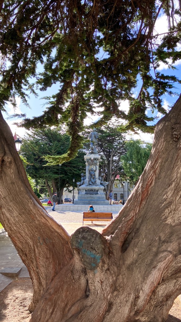 Am Rand der Strasse vom Flughafen in die Stadt wandert eine grosse Gruppe junger Frauen und Männer und recken den Daumen in die Höhe … kennen wir von unseren ersten Reisen. Wir stoppen und drei der jungen Leute quetschen sich mit ihren grossen Rucksäcken zu uns in den Wagen. Und sie setzen die gleichen Prioritäten wie wir früher – wie alt das klingt: Als erstes übernimmt der junge Mann die Kontrolle über unser Radio, quetscht sich von hinten nach vorne durch und sucht einen Radiosender mit ansprechendem Musikprogramm. Dann klären wir das wer, woher, wohin und checken gegenseitig unsere Instagram Profile. Wir haben Studenten im Auto, Sofias und Thomas’ Namen merken wir uns (Dank Instagram Follower :-)) … alle drei sind Pfadfinder (sie tragen alle das gleiche gezwirbelte Halstuch und nennen sich „Scouts“) die an einem Projekt in Patagonien teilnehmen. Thomas kennt sich in der Welt aus und erklärt den beiden Damen, was dieses exotische „Switzerland“ ist, wo wir herkommen. Nebenbei erfahren wir, dass der aktuelle Präsident Chiles in Punta Arenas aufgewachsen ist und genau hier in diesem Park auf einen Baum kletterte, um zu seinen Anhängern zu sprechen … natürlich findet Thomas schnell im Internet ein Beweisfoto. Wir dürfen die 3 an der Universität von Punta Arenas aussteigen lassen und freuen uns über den gelungenen Start in unsere Patagonien Reise.