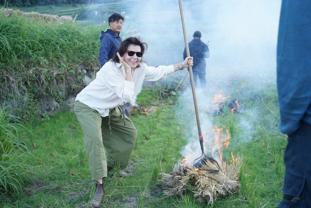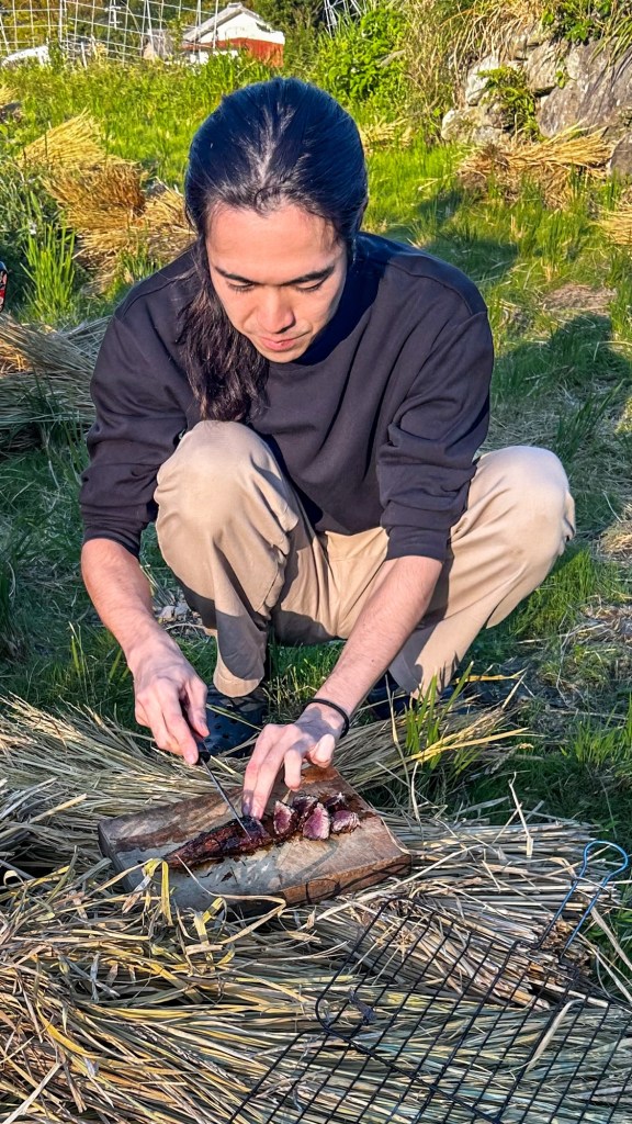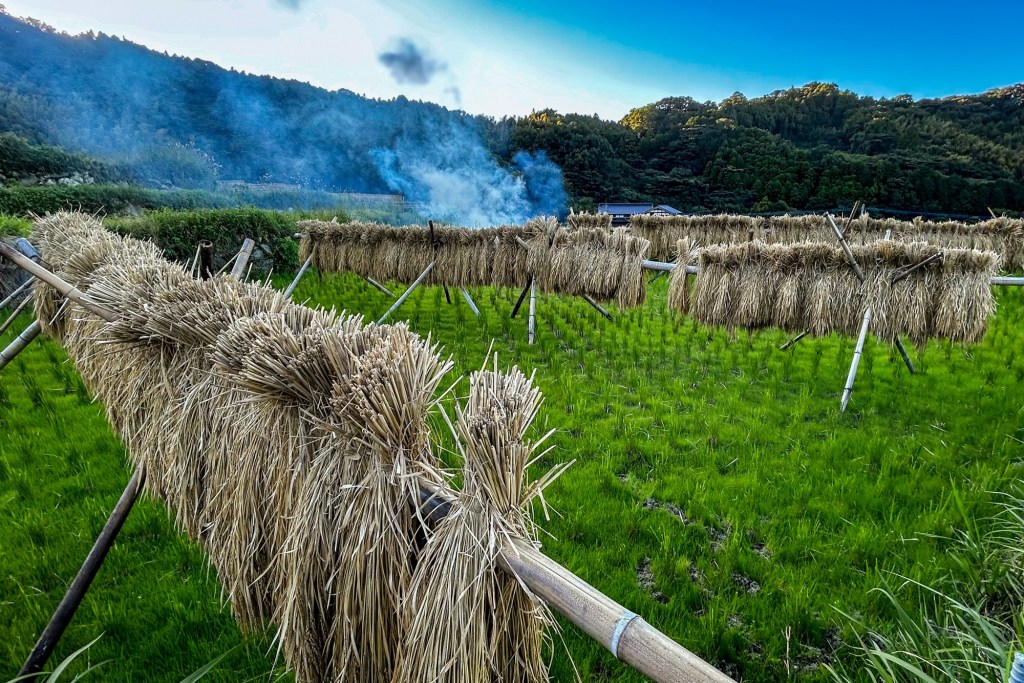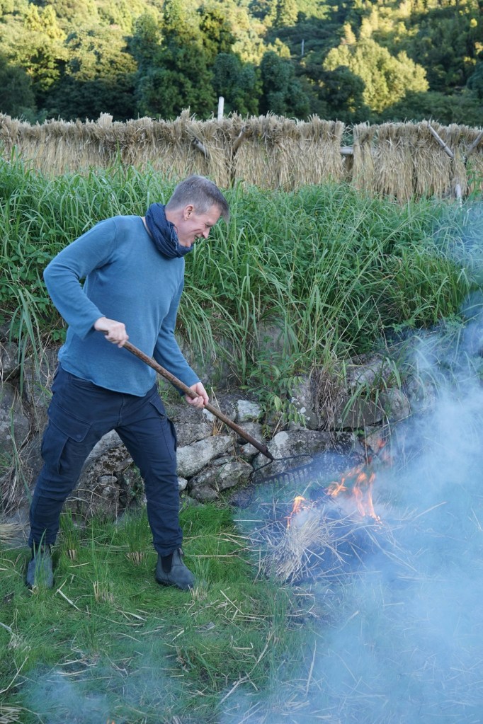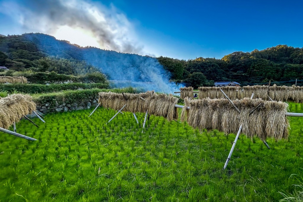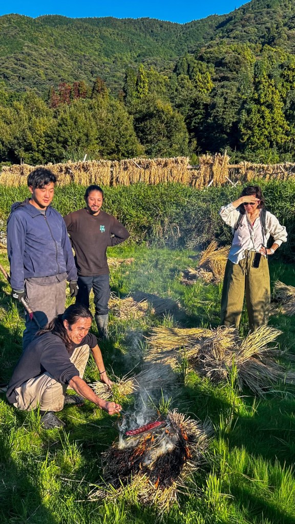 Am richtigen Reisfeld angekommen, ist eine grössere Gruppe von jüngeren Menschen damit beschäftigt uns zu begrüssen, in einem wilden Mix aus viel japanisch, wenig englisch und zwei Wörtern in Deutsch zu erklären, was sie hier gerade machen und was unser Job sein könnte. Das können wir in Erfahrung bringen: Wir sind hier richtig und lernen Chiharu und ihren Mann kennen. Der Reis ist bereits abgeerntet und gestern wurde bereits das erste Mal der frische Reis des Jahres probiert. Nun wird das in Bündeln zum trocknen aufgehangene Reisstroh auf dem terrassierten Feld mit viel Rauch verbrannt. Der Rauch wird genutzt, um einen mitgebrachten frisch gefangenen Fisch zu räuchern. Genau unser Ding: solidarische Landwirtschaft und Räucherfisch 🙂 …