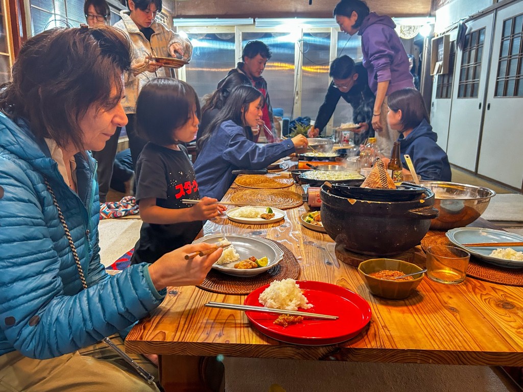 Am Abend sitzen wir zusammen im grossen Raum mit zwölf Menschen und haben ein wenig den Überblick verloren. Wer ist wer und steht wie in Beziehung zu wem? Draussen ist es dunkel und wird immer kälter. Das Haus ist ein luftiger, 100 Jahre alter Holzbau mit dünnen Wänden und einfach verglasten Fenstern. Wir hocken alle um den grossen Tisch herum und kochen unser Abendessen. In einem grossen Tontopf dampft der frische Reis, frischer Fisch liegt roh oder gegrillt auf einem kleinen Teller und alle sind damit beschäftigt den Hauptgang zuzubereiten.