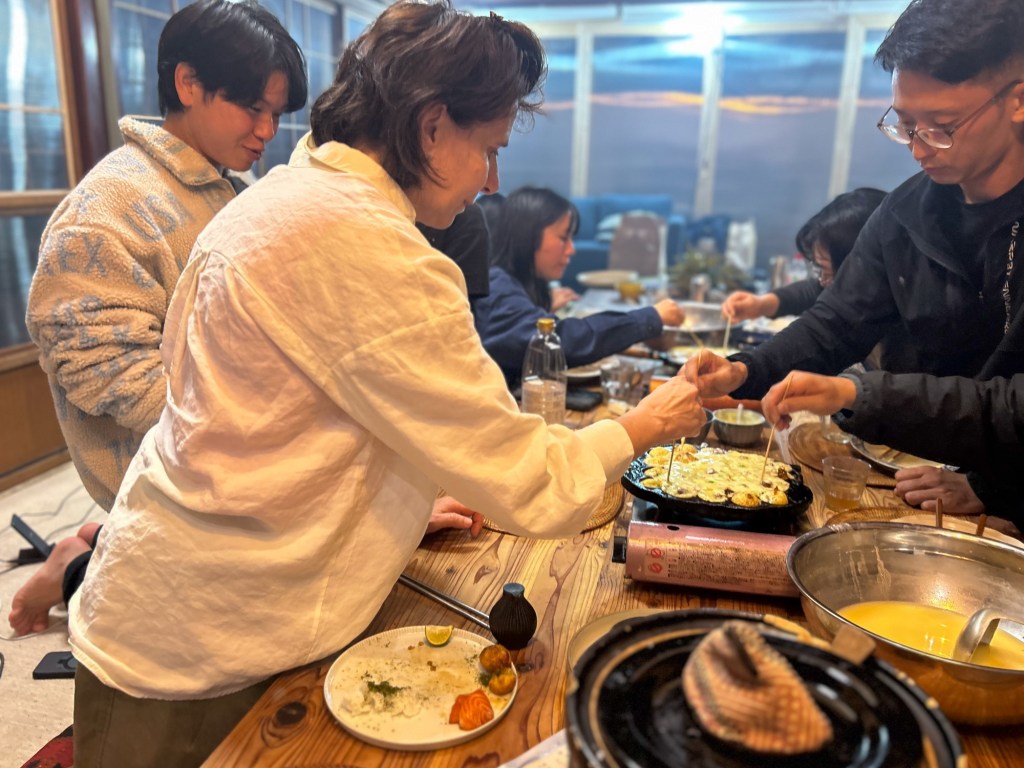 Es gibt Takoyaki. Die kleinen Teigbällchen mit Oktopus Stückchen gefüllt werden in einer speziellen Pfanne über einem Gaskocher am Tisch von uns allen zubereitet. Die Pfanne hat viele kleine, halbkugelförmige Vertiefungen in welche Öl gepinselt wird und anschliessend eine Art Eierkuchenteig mit einer Kelle gegossen wird. Darüber werden die Oktopusstücke (Tako), Zwiebelstückchen und Käse gestreut. In der Halbkugel wird der Teig fest und braun und dann muss mit einem Stäbchen stochernd, geschickt die Masse gewendet werden um den noch flüssigen Teig auch von der anderen Seite kugelförmig weiter zu backen. Irgendwann landet die aussen knusprige, innen noch leicht flüssige, brüllend heisse Kugel auf deinem Teller und wird mit Stäbchen in den Mund transportiert – köstlich aber so heiss!