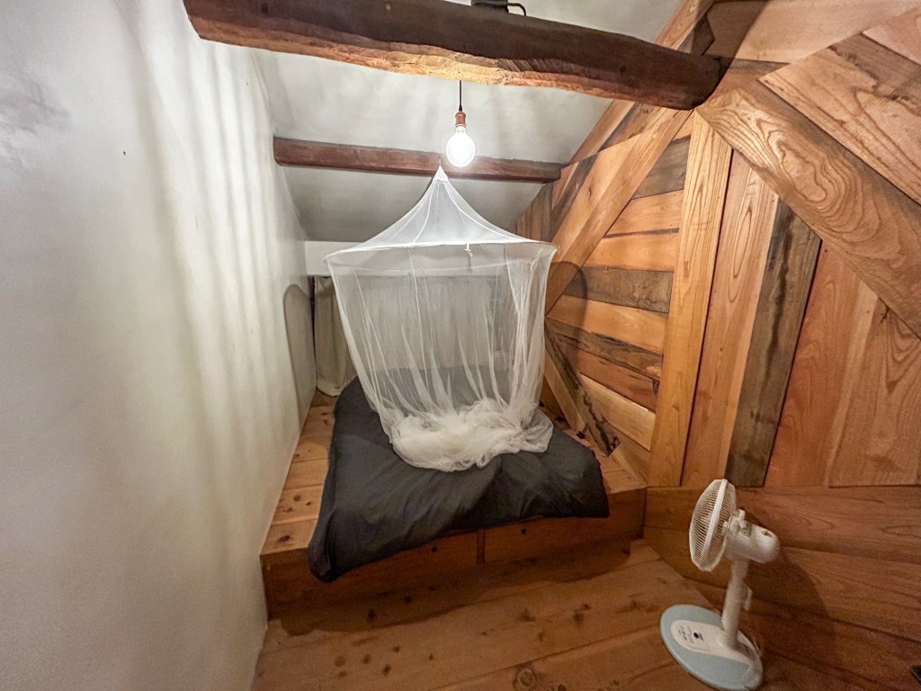 Der Tag bietet noch eine rasante Abfahrt auf der Ladefläche eines kleinen Lasters zurück ins Dorf, einen Rundgang über den Hof und etwas Verständnis in das Konzept, nach dem hier gelebt wird. Chiharu und Kooichi leben mit ihrer 5jährigen Tochter gemeinsam mit wechselnd vielen, anderen Menschen in einem „sharing home“ zusammen. Die meisten Räume im Haus werden gemeinschaftlich genutzt (Küche, Bad, ein grosser Wohnraum mit Tatami Matten und einem grossen, niedrigen Tisch). Die hier Mitwohnenden haben jeweils einen kleinen Raum mit Privatsphäre für sich (ein winziger Schlafraum). Unser, ebenfalls kleiner Schlafraum befindet sich nebenan im Speicher einer Scheune.